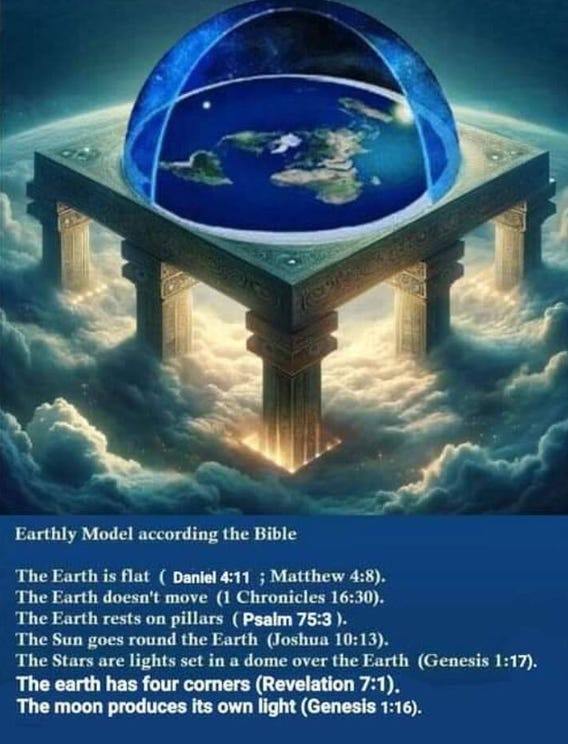 Some interpretations of the Bible describe the Earth as a flat, structured plane with a firmament above it, rather than a spinning ball floating in space. Passages that speak of “the four corners of the Earth,” “the foundations of the Earth,” and “the circle of the Earth” are read by flat‑Earth believers as implying a flat or disc‑shaped Earth rather than a globe.