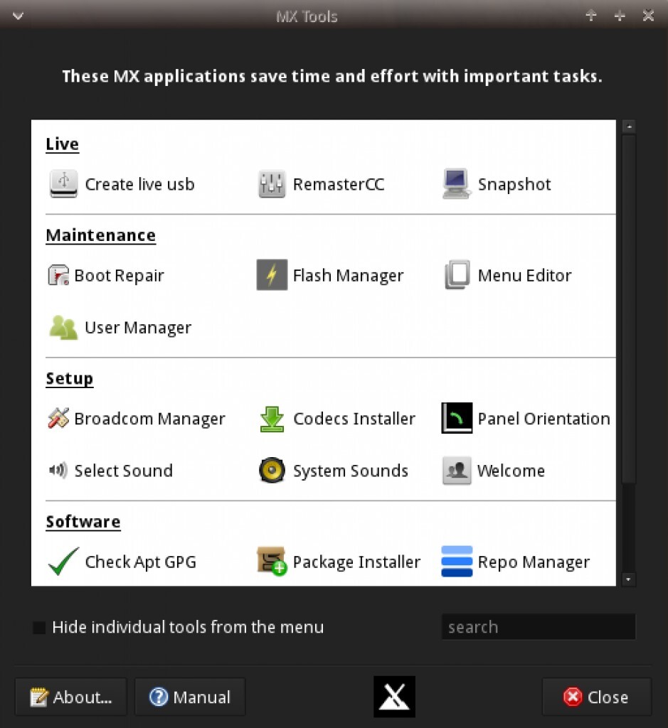 settings. You’ll find a pretty nice Apt notifier to let you know when updates are available, and includes a history of all the application installs you’ve made. I also like the MX Tools application which includes the pretty darned cool feature to ‘save System to ISO’. The last feature of note is the ability to turn on system sounds, which is fairly uncommon in Linux distributions.