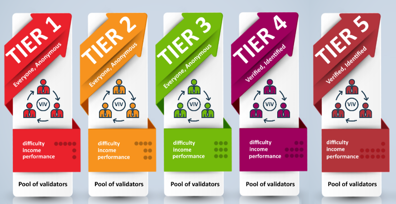 El Protocolo de Prueba de Validación (POV) ha sido diseñado para dos propósitos principales. Primero, proporciona los medios para distribuir trabajos de validación y valoración dentro de la red descentralizada basada en blockchain y asegura el flujo de tokens entre los usuarios del sistema. En segundo lugar, el algoritmo intrínseco gobierna la neutralidad y la precisión de las respuestas de los validadores, creando una base de confianza sobre la cual se debe construir cualquier sistema similar. Una combinación de datos estadísticos y un modelo incentivador de diferentes niveles de validación se encuentra en el corazón del sistema. Por un lado, el sistema analiza automáticamente las valoraciones del experto, buscando discrepancias, mientras que, por otro lado, recompensa a los validadores con las tasas de éxito más altas al ofrecer la oportunidad de actualizar una cuenta al nivel superior.
