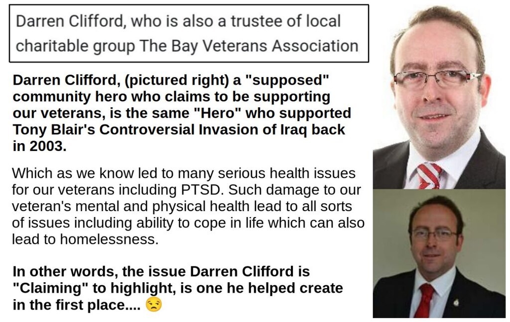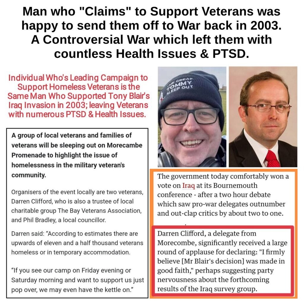 "Hero" Darren Clifford, who claims to be supporting veterans, also supported Tony Blair's Controversial Invasion of Iraq back in 2003.