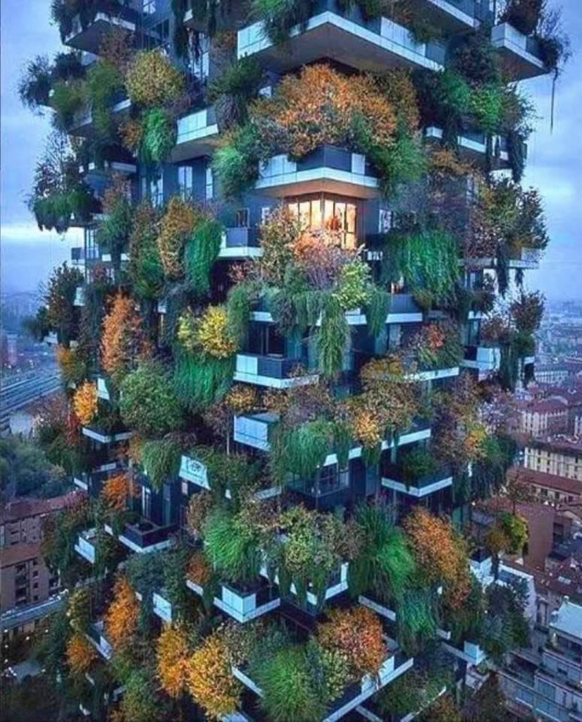 The Bosco Verticale / Vertical Forest high-rise complex in Milan, Italy. The plant life, which is said to equal 3 hectares of forests (20,000 sq m), not only moderates the temperature in summer and winter but also converts as much as 30 tonnes of CO2 each year. On top of that, it filters out dust particles, protects the residents from noise pollution and creates a microhabitat for insects and birds.