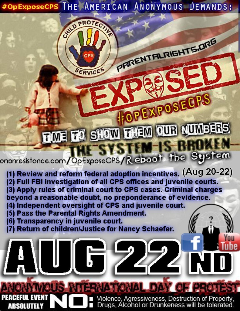#OpExposeCPS: Operation Expose Child Protective Services/Child Welfare International. Group for sharing information and stories pertaining to exposing corruption in the child welfare systems of the world. Also a support group for victims of child welfare