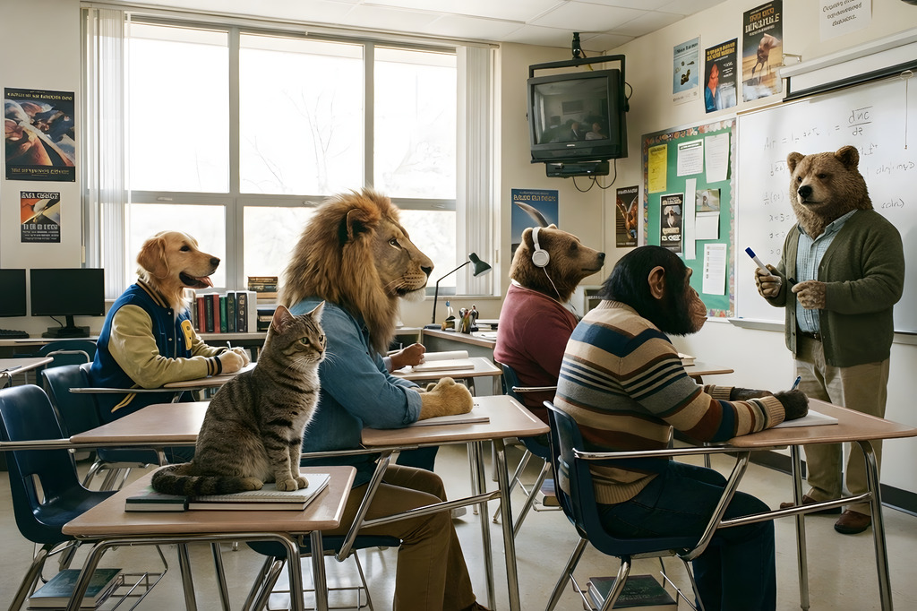 If your high school teachers were animals, what would they be? 🐾 The strict principal? Probably a a mean tomcat. The math teacher? Would you believe a gorilla? The track coach? Definitely a cheetah. My new book Fur, Feathers, and Final Exams uses realistic AI images to create a high school where EVERYONE is an animal — the students, the teachers, the principal, even the football team. (Note: The "photographs" are fake...or are they?) What animal would your toughest teacher be? Fur, Feathers, and Final Exams is available on Amazon and Lulu.com.