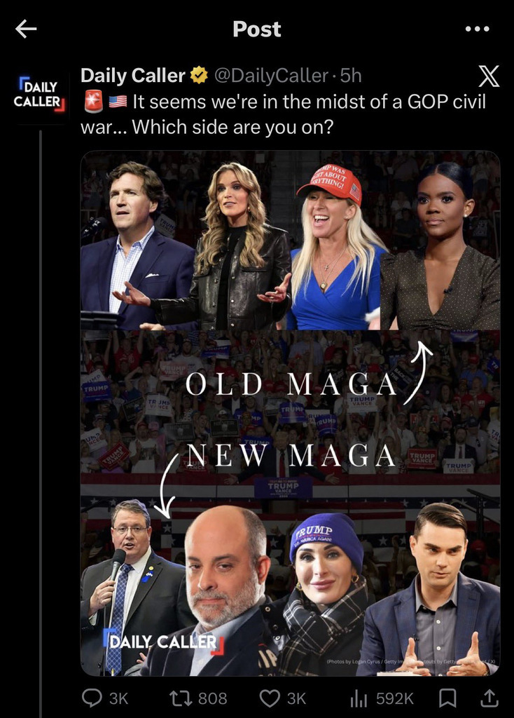 Let’s go through them. LOOSING MONEY YOU FLIP-FLOP AGAIN “OLD MAGA.” Carlson absolutely loathed Trump but kissed his ass for his own reasons; Kelly is just a fraud who chases clicks; MTG and Owens are low-IQ grifters. “NEW MAGA.” Ok, Randy Fine appears only because he’s annoying and corpulent; Levin has been one of Trump’s major defenders since January 2017, especially on RussiaGate; Loomer is as OG Trump loyalist as anyone alive; and Shapiro just calls balls and strikes as he sees it. Also: Fuck the Daily Caller.