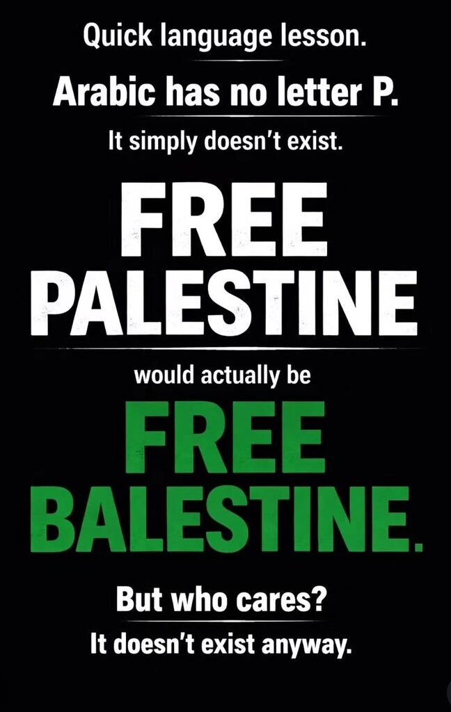 Or Falestine, which is even funnier. Arabic often replaces Ps with Fs, as in the case of the language name Farsi, which uses the Arabic alphabet. It's actually Parsi (as in Persian), but like everything, the Arabs had to F it up.
