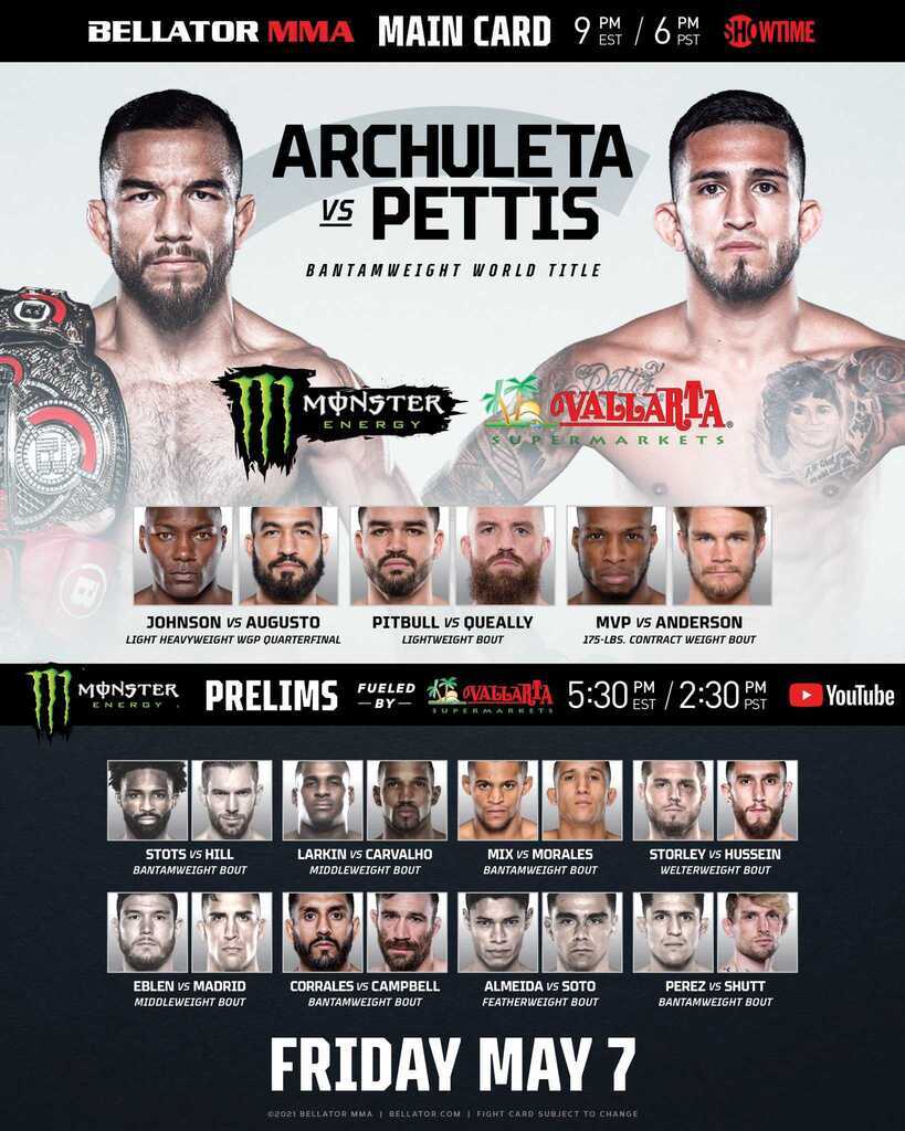 Archuleta vs. Pettis Friday 05.07.2021 _ U.S. Broadcast Main Card at 9 PM ET on Showtime Prelims at 530 PM ET on YouTube _ Venue: Mohegan Sun Arena Location: Uncasville, Connecticut, United States This is about as stacked as Bellator cards get folks! -Sergio Pettis gets his...See more