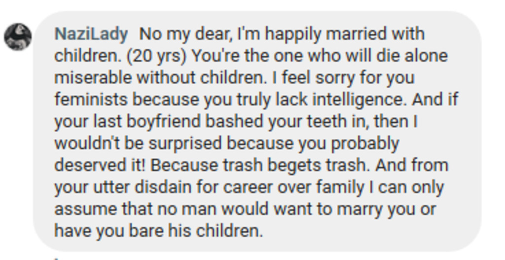 Nazi lady defending domestic abuse against women who don't comply with their abuser's demands. Also does not understand the meaning of the word "disdain".