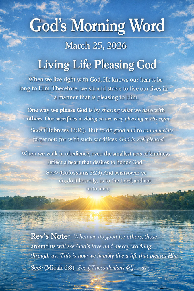 God’s Morning Word Living Life Pleasing God March 25, 2026 When we live right with God, He knows our hearts belong to Him. Therefore, we should strive to live our lives in a manner that is pleasing to Him. One way we please God is by sharing what we have with others. Our...See more
