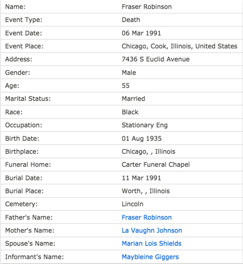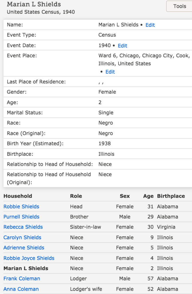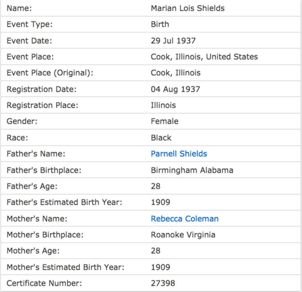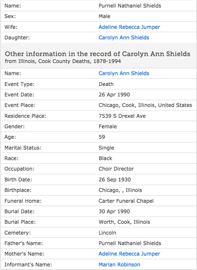 : "Illinois, Cook County Deaths, 1878-1994," database, FamilySearch (https://familysearch.org/ark:/61903/1:1:Q23W-L4DV : 18 March 2018), Purnell Nathaniel Shields in entry for Carolyn Ann Shields, 26 Apr 1990; citing Chicago, Cook, Illinois, United States, source reference , record number , Cook County Courthouse, Chicago; FHL microfilm .