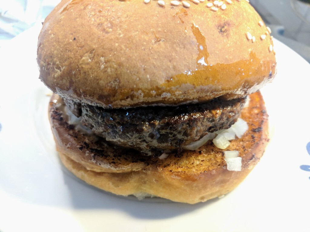 Burger med Sous Vide bøffer, løg, syltede agurker og dressing på under bollen bestående af 2/3 Majo 1/3 Ketchup, sukker, salt og peber. Overbollen fik en omgang BBQ. #burger#nosalad#sousvide#manfood