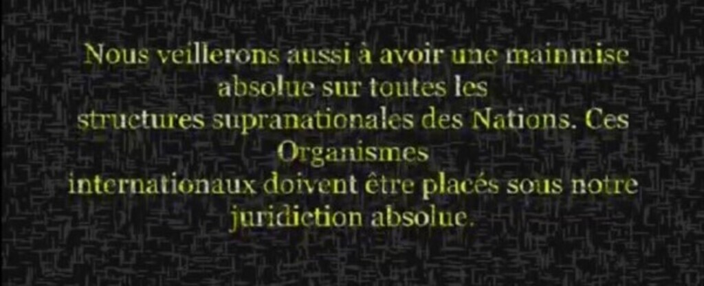 page précédente https://www.minds.com/newsfeed/1190457015802286080 Source : https://youtu.be/t99At1xHOYE?t=1781 Nous veillerons aussi à avoir une mainmise absolue sur toutes les structures supranationales des Nations. Ces Organismes internationaux doivent être placés sous notre...See more