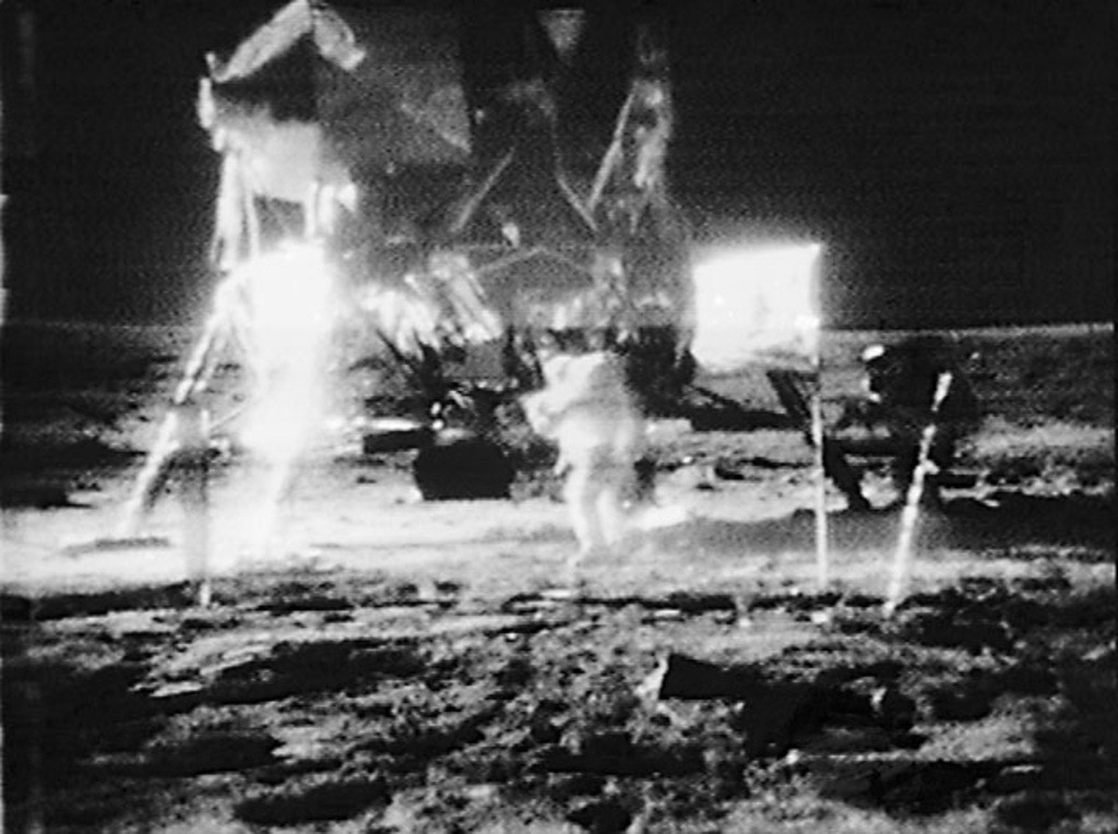 Slow-scan Polaroid taken at Goldstone tracking station reveals far more detail than publicly broadcast TV during Apollo 11 moonwalk. Search is underway to locate old Apollo tapes and freshen them up with new digital technologies.