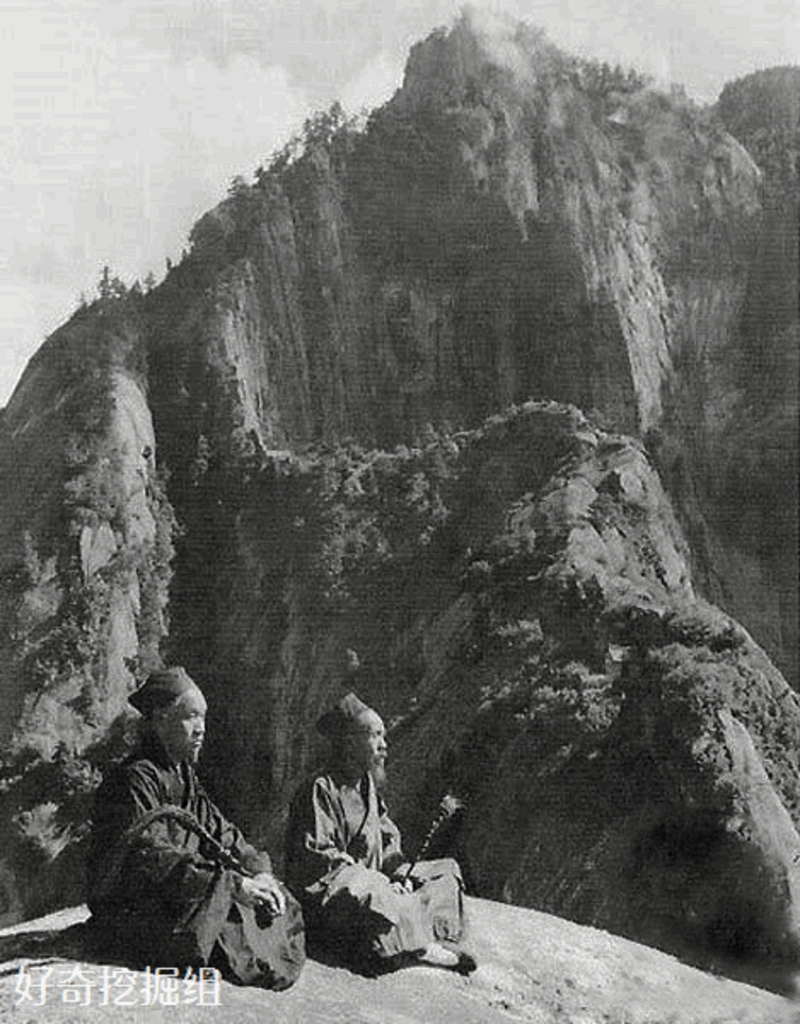 Two ageing Daoists in Mt Hua (Huashan), the most perilous mountain in China. Early 20th century. Shannxi Province.