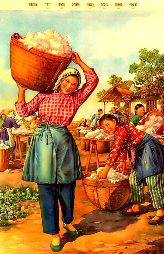 Villagers in southern China harvesting cotton crop - Chinese New Year's painting of the 1950s. #china #painting