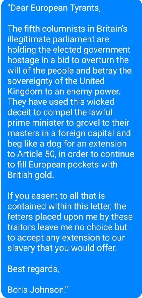 When parliament forces Boris to send a letter requesting an extension to article 50, this is what I expect it to look like.