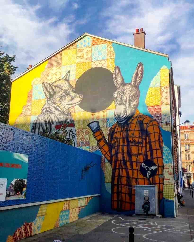 #evazesirnrc du gang No Rules Corp, un peu de pochoir, un peu de dechirage d’affiches, de l’utilisation de pleins de matières pour vous presenter ce loup et cet âne qui ont bien du mal à jouer a Pierre/feuille/ciseaux