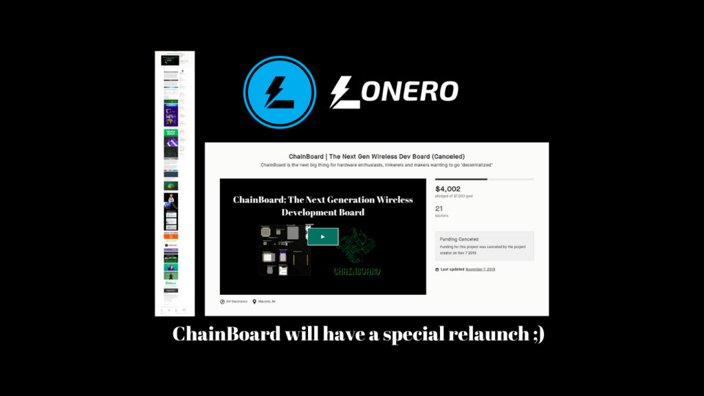 ChainBoard didn't meet its 1 month Kickstarter Goal. A few lessons were learned in marketing, vetting out services, and project planning. We plan to have a special relaunch though, and this is a drop in the water/side project compared to other stuff we are doing :) @LoneroLNR