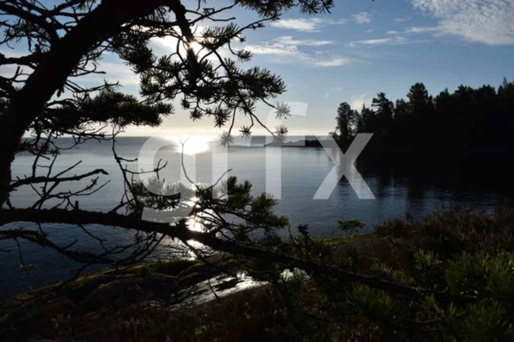Down by the lake, early in the morning. The sun is rising over the Lake's blue and crystal-clear waters. A bit of early morning mist is quickly dissipating.