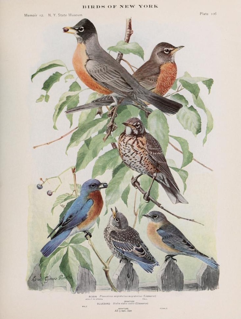bird photography thumbnail links in comments American Robin . Turdus migratorius Bluebird . Genus: Sialia Sialia sialia (Eastern bluebird) Sialia mexicana (Western bluebird) Sialia currucoides (Mountain bluebird) Birds of New York Annual report 1912 Illustration 1902 Artist LouisAgassiz Fuertes (1874 - 1927) Naturalist, ornithologist, illustrator, artist Public Domain #nature #outdoors #ornithology #illustration #art
