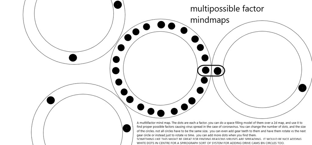 NOT CLEARLY THOUGHT OUT BUT SOMETHING LIKE THIS WOULD BE COOL FOR FINDING THE GEARING OF HOW VIRUSES ARE WORKING IN SOCIETY, AND WHERE CAN ADD EXTRA STRANGE FACTORS THAT ARE CAUSING IT, OR TRY AND THINKTANK THEM UP ALSO. AND MAKES A BIG MACHINE DIAGRAM, WHICH WORKS SORT OF LIKE A SPIROGRAPH OVER A 2D MAP.