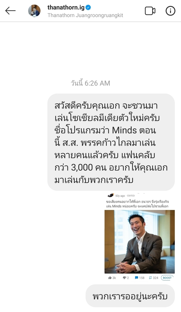 ส่งข้อความชวนพี่เอก ธนาธรมาเล่น Minds แล้วนะครับ รอการติดต่อกลับ