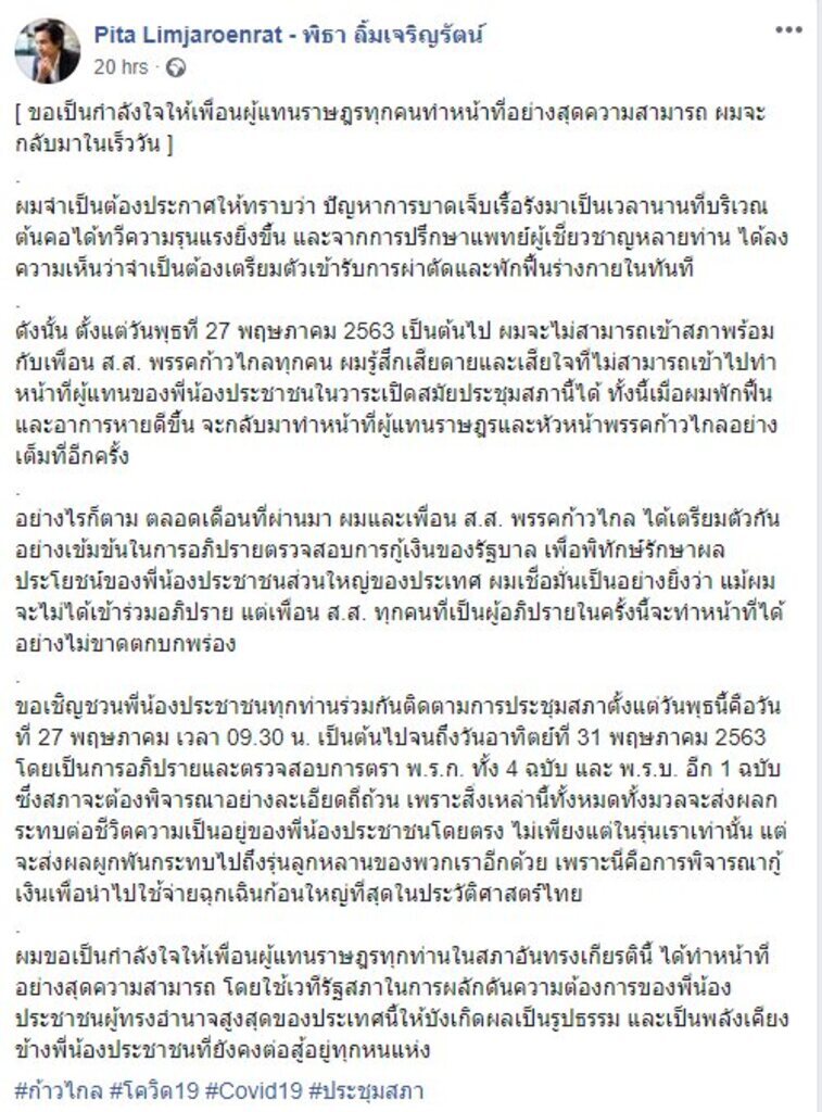 เสียดายคุณทิม พิธา หัวหน้าพรรคก้าวไกลไม่สามารถเข้าร่วมการประชุมได้ เนื่องจากต้องเตรียมตัวเข้ารับการผ่าตัดอาการบาดเจ็บที่ต้นคอ ขอให้การผ่าตัดเป็นไปด้วยความเรียบร้อย ปลอดภัย และหายเป็นปกติเร็วๆ นะคะ