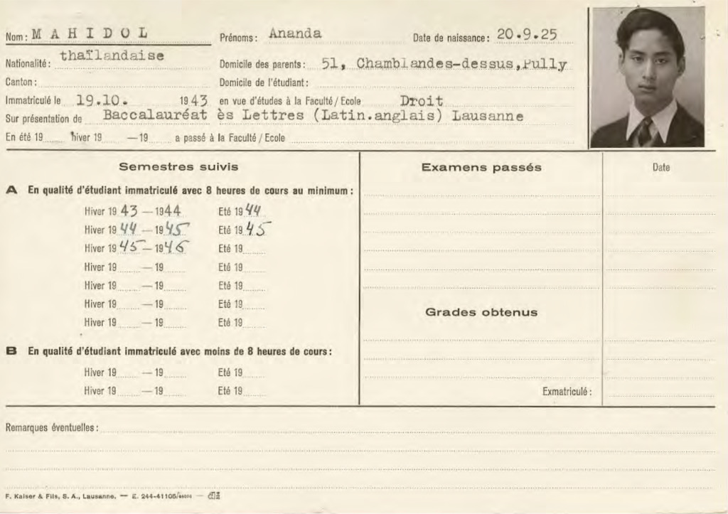 Official record of the studies of Ananda Mahidol, King Rama VIII, at the University of Lausanne in Switzerland.
