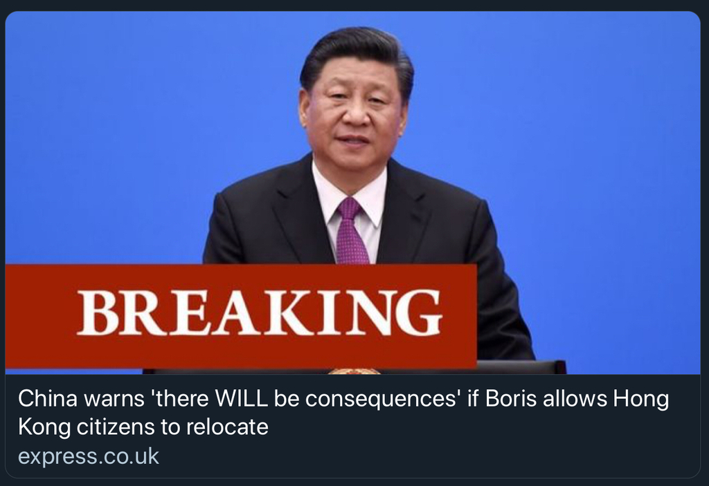 สัปดาห์ก่อน บอริสจอห์สันนายกอังกฤษบอกว่าจะให้ชาวฮ่องกง 3 ล้านคนอพยพไปเป็นประชากรอังกฤษหากจีนไม่ปฏิบัติตามข้อตกลง ปี 97 เข้ายึดครองฮ่องกงก่อนถึงกำหนด