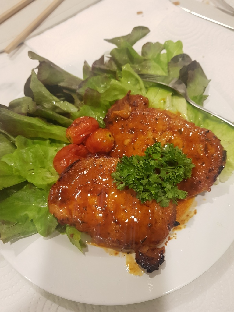 ตอนหมักเราใส่น้ำไปช่วยให้ซอสหมักเหลวหน่อย เราหมักประมาณ 1 ชม. แล้วก็เอาเข้าหม้อทอดไร้น้ำมัน แต่ต้องรองด้วยฟอยล์นะ เนื้อหมูจะได้ฉ่ำๆ โดยใช้อุณหภูมิ 180 15 นาที แต่ระหว่างนั้นต้องพลิกกลับด้านด้วย ถ้ามีเห็ดหรืออะไรก็ใส่ๆย่างเข้าด้วยเลยทีเดียว พอเสร็จแล้วใส่จาน พร้อมผักสลัดต่างๆที่ล้างสะอาดแล้วกินกันกับแฟนแล้วแฮปปี้มากก