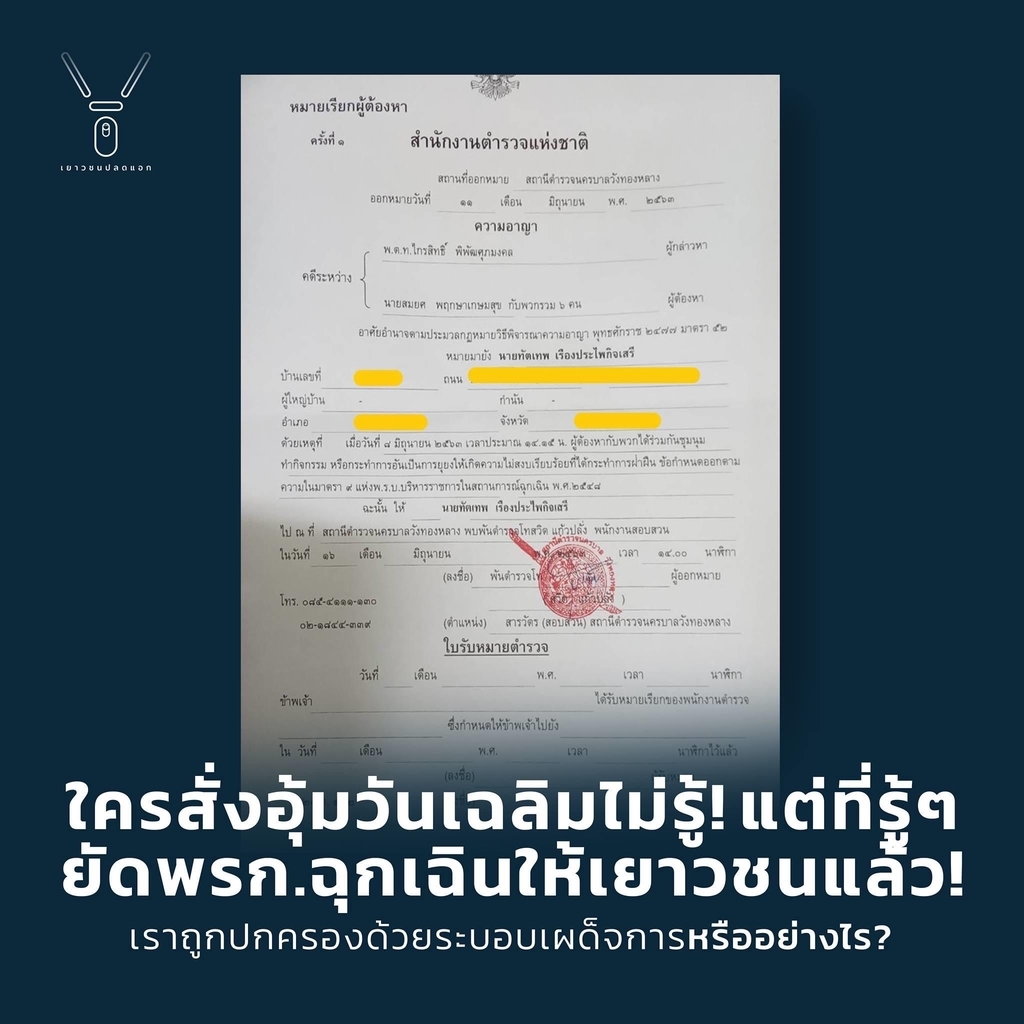 ใครสั่งอุ้มวันเฉลิมเจ้าหน้าที่รัฐบอกไม่รู้! แต่ที่รู้ๆ ยัดข้อหาให้เยาวชนแล้ว! หมายเรียกฟอร์ด ทัตเทพ บัณฑิตจบใหม่จากคณะรัฐศาสตร์ จุฬาลงกรณ์มหาวิทยาลัย จากสน.วังทองหลาง โดยอ้างว่าฝ่าฝืนพรก.ฉุกเฉิน ในวันที่ไปเรียกร้องความยุติธรรมให้กับวันเฉลิม หน้าสถานทูตกัมพูชา #SaveTadtep #SaveWanchalearm #MindsTH #FreeYOUTH #PoliticsTH