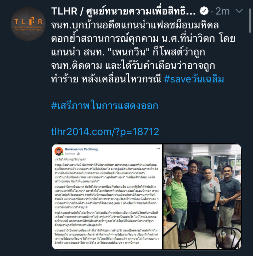 ตามมาถึงบ้านเลยนะ เจ้าหน้าที่ส่งหมายเรียก ไล่คุกคาม ข่มขู่ ตามถึงบ้านเตือนว่าจะถูกเล่นงานทำร้ายนักศึกษา สนท. ที่ร่วมทำกิจกรรม #saveวันเฉลิม #Thailand