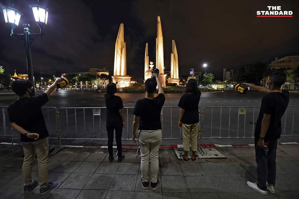 เยาวชนรวมตัวอนุสาวรีย์ประชาธิปไตย ทำกิจกรรมเชิงสัญลักษณ์ ‘ส่องไฟฉาย’ ไปที่พานรัฐธรรมนูญ