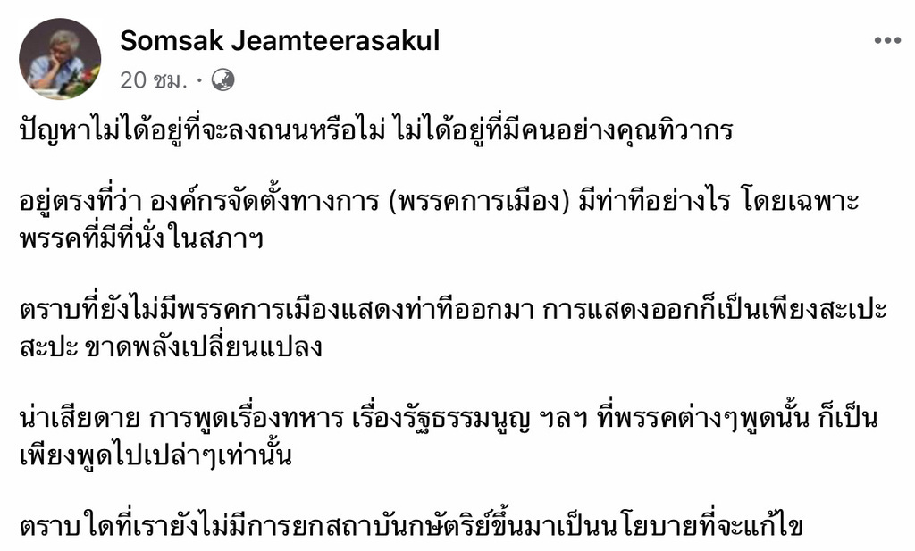 เห็นด้วยกับ อ.สมศักดิ์มากๆครับ คาดหวังว่าสักวัน จะมีสักพรรคที่กล้าลุกขึ้นมาพูด เพราะการสู้กันนอกสภา ผลสุดท้ายก็ออกมาเหมือนเดิมทุกที
