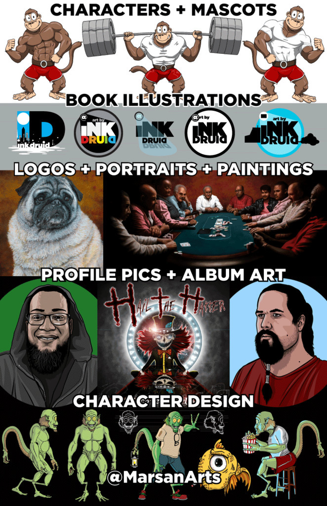 I'm a hired pen/paintbrush...DM me for whatever you may need.