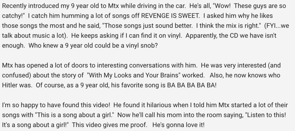 Get that kid some vinyl: comment left on the MTX live at the RCKNDY video. https://youtu.be/o3rLDTkAAMc Welcome aboard, kid.