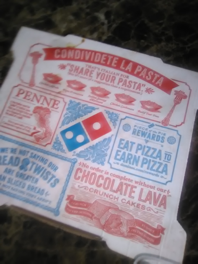 Condividete 19 LOL That is what this message on this Dominoes Pizza Box reminds me of. LoL Condividete La Pasta "Share Your Pasta" (Share Your Barley Porridge?) Share Your Barley #Covid19 Porridge. LoL •PASTA Etymology: First attested in English in 1874, the word "pasta" comes from Italian pasta, in turn from Latin pasta, latinisation of the Greek παστά (pasta) "barley porridge". #DomPolitics #News #Pizza #Food