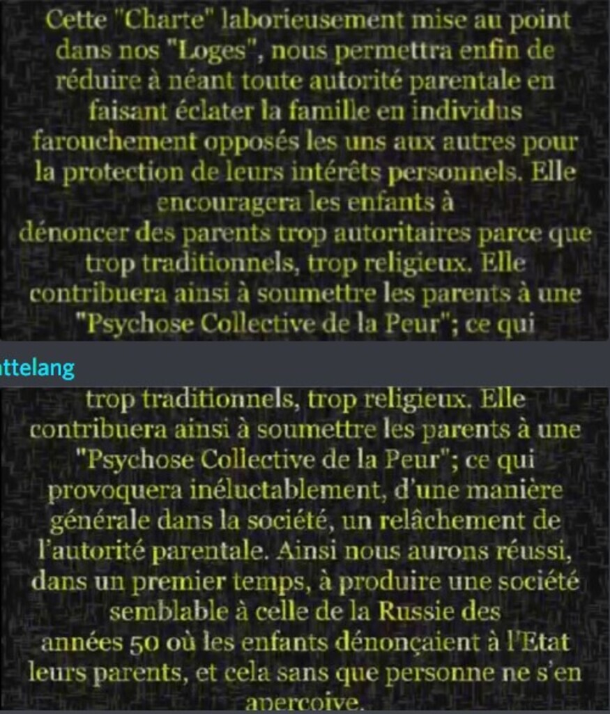 Cette «Charte» laborieusement mise au point dans nos «Loges», nous permettra enfin de réduire à néant toute autorité parentale en faisant éclater la famille en...See more