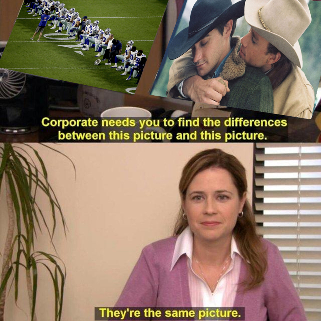 Anybody else lowkey happy that the #Cowboys knelt for #BLM so I could make this Brokeback Mountain + The Office #meme? #politics #memes
