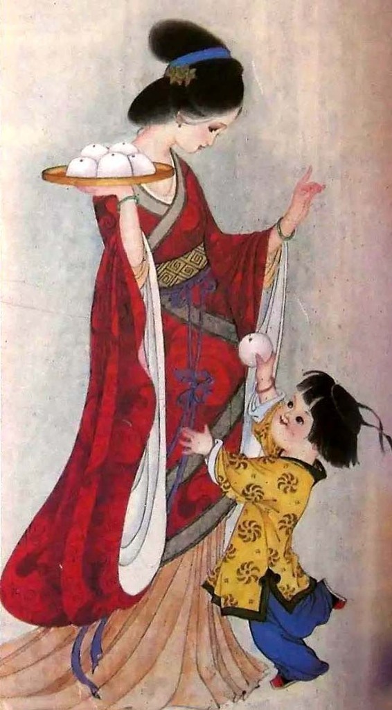 An ancient Chinese mother and her child - ink painting in meticulous style by Chinese artist Wang Mulan.