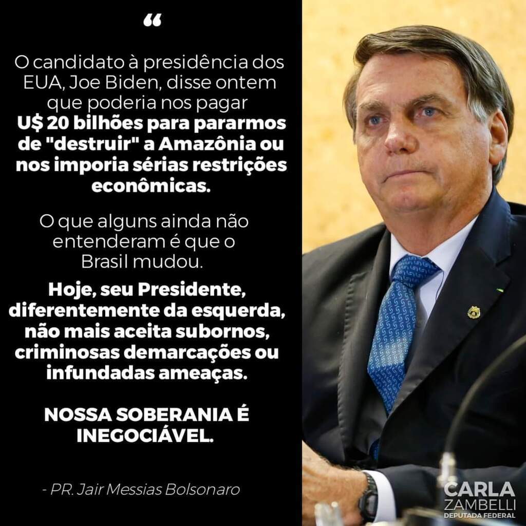 Na foto está escrito: "O candidato à presidência dos EUA, Joe Biden, disse que poderia nos pagar US$ 20 bilhões para pararmos de "destruir" a Amazônia ou nos imporia sérias restrições econômicas.