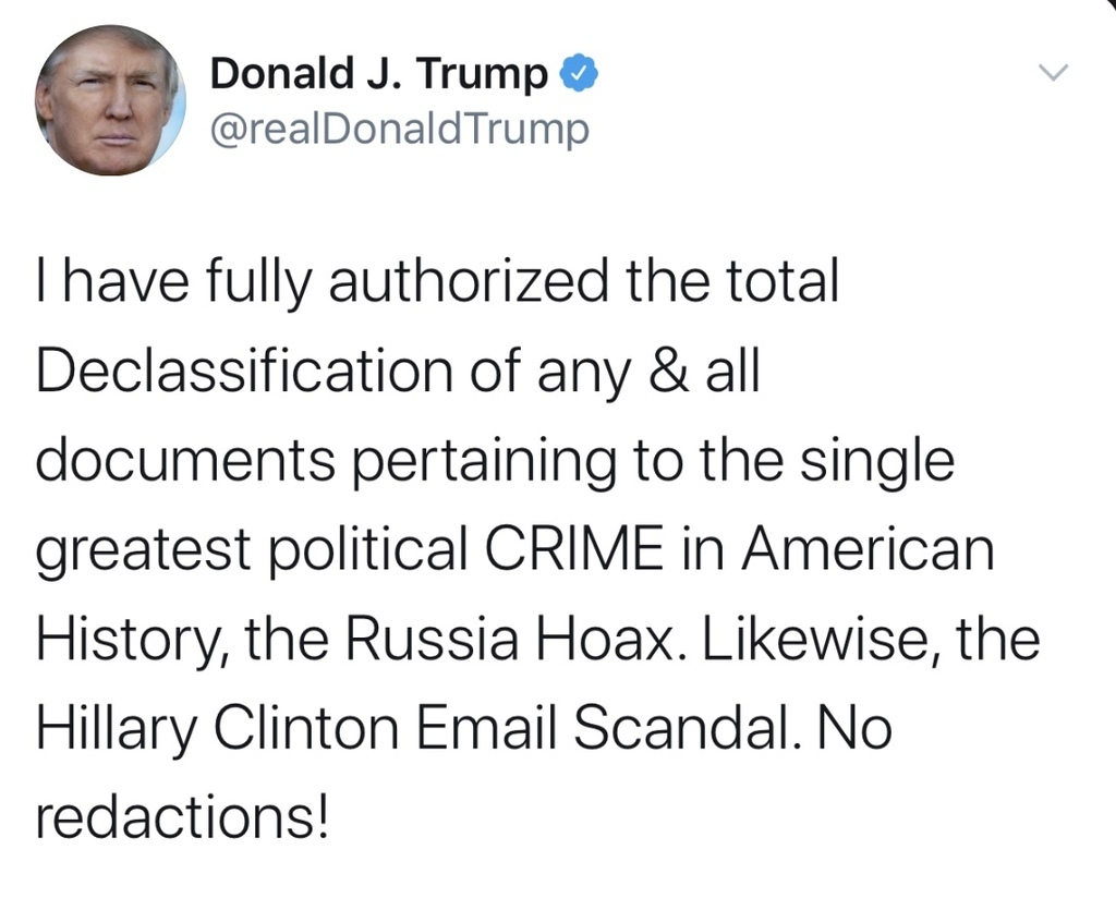 BREAKING: President Trump declassifies all “Russiagate” documents... without redactions.