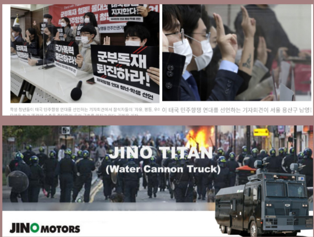 16 องค์กรนักศึกษาเกาหลีใต้ สนับสนุนการเคลื่อนไหวเพื่อประชาธิปไตยในไทย ประนามเจ้าหน้าที่ใช้ความรุนแรงต่อการสลายการชุมนุม..เรียกร้องให้ Jino Motors (지노모터스) บริษัทผลิตรถฉีดน้ำความแรงสูง “หยุดส่งออกความรุนแรง” ไม่ขายให้รัฐบาลไทยไปทำร้ายเยาวชน (ภาพข่าว http://Hani.co.kr) #mindsth #thailand