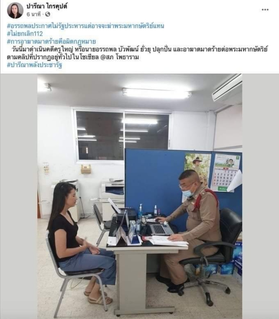 ีมีผู้แอบอ้างว่าเป็นตำรวจ อุ้ม "คุณครูใหญ่" โดยอ้างว่าเป็นหมายความผิด 112 ของ สภ.อุดรฯ แต่พาตัวไปที่มักกะสัน ทั้งที่ความจริงผู้แจ้งให้จับ 112 คือนางปารีณา แจ้งที่ สภ.โพธาราม ราชบุรี จึงเชื่อได้โดยสุจริตใจว่า สิ่งพิมพ์ที่นำมาอ้างว่าเป็นหมายจับ เพื่อพาตัว "คุณครูใหญ่" ไปนั้น เป็น "ของปลอม"