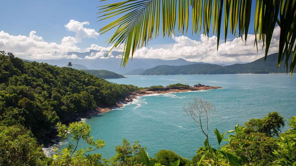 ...ated in the municipality of Ubatuba, lies this beach which is known for its tranquil atmosphere and clear water. On the other side of the bay, the mountains can be seen..
