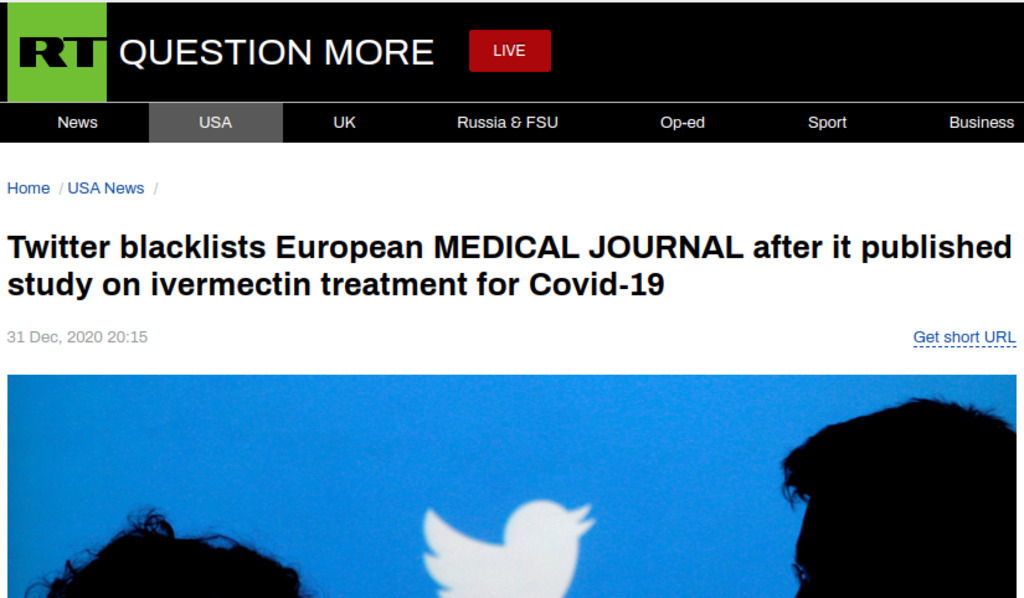 Twitter is now censoring medical journals 🤨 🤨 🤨 🤨 🤨 🤨 https://www.rt.com/usa/511259-twitter-censors-ivermectin-journal-covid/
