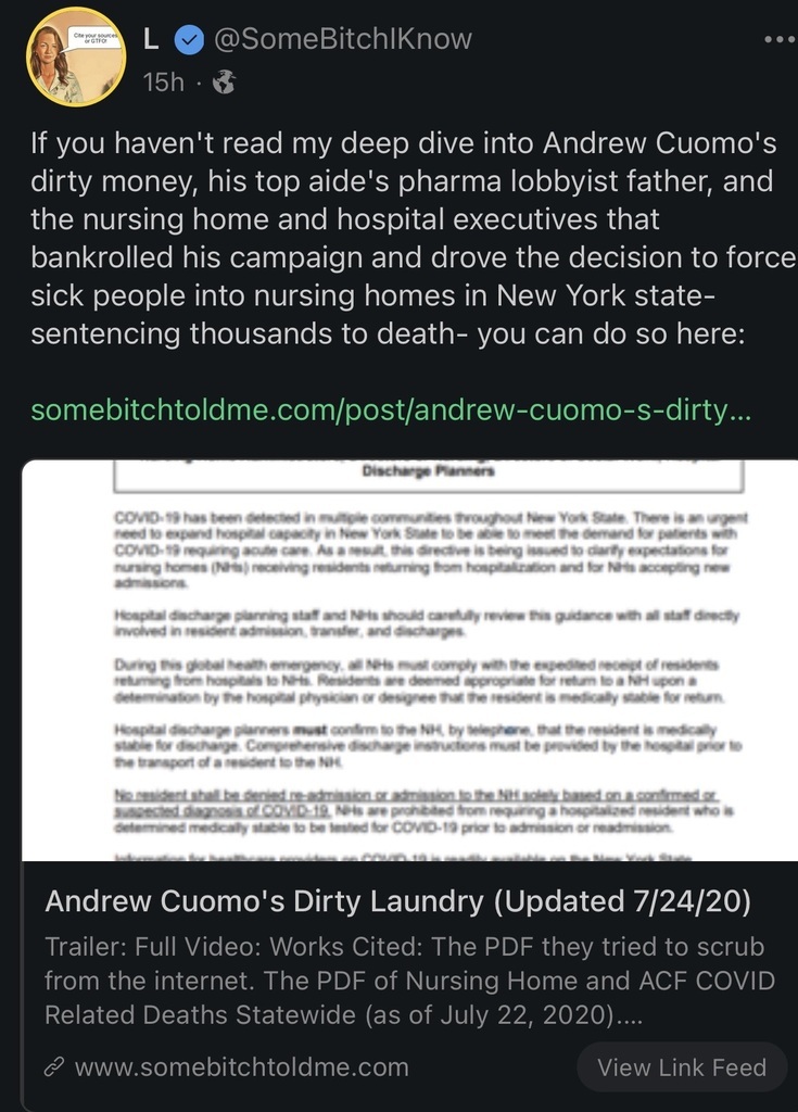 Some b1tch I know has receipts, and Cuomo has blood soaked money. https://gab.com/SomeBitchIKnow/posts/105548132955501751