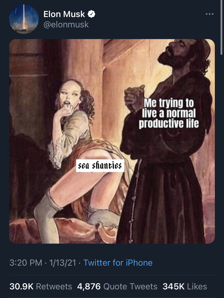 I am inspired by Elon’s ability to not give a fuck and still post random shit he personally thinks is funny. Legend