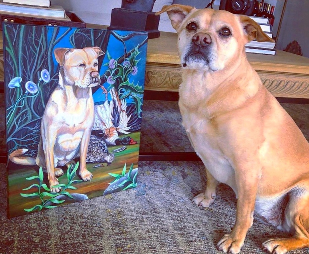 Maddie posing with the Pet Portrait I painted of her! She loves it!