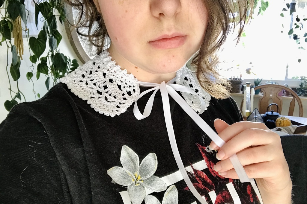 Finished crochet peter pan collar. Complete with cat hair