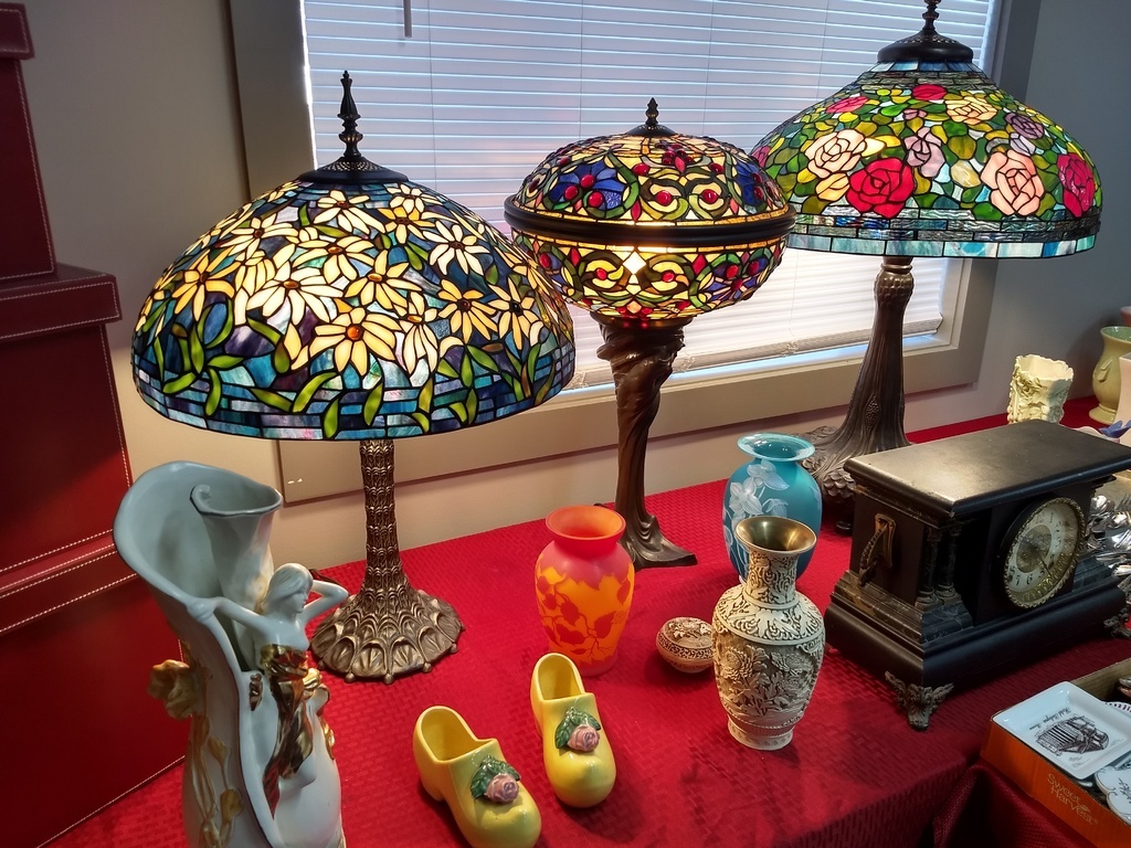 Super nice stained glass lamps at a rural Kansas auction. Individual pics in comments.
